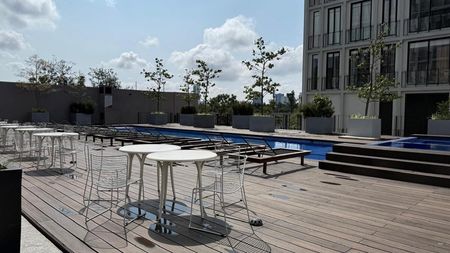 El edificio ofrece amenidades como alberca, gimnasio, área de eventos y espacio de co-working. Además, cuenta con caseta de guardia y servicios básicos como agua y luz.